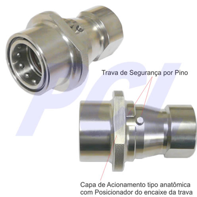 Dispositivo de segurança incorporado ao acoplador do engate tem a função de travar o acionamento da capa (luva) impedindo manuseios indevidos que poderiam provocar desacoplamentos acidentais. A trava de segurança é utilizada também em aplicações sujeitas a excessiva vibração mecânica. Normalmente o opcional Trava de Segurança é fornecido em conjunto com o opcional Capa Anatômica.