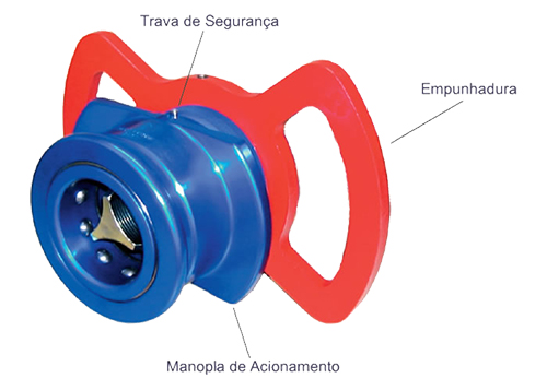 Sua configuração inclui manopla de acionamento tipo “anatômica” e pode incluir também trava de segurança incorporada ao conjunto.