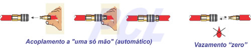 Automático – conexão a uma só mão: A construção do engate possibilita o acoplamento do pino macho apenas empurrando-o para dentro do acoplador fêmea (pressão residual de 3 bar máximo).