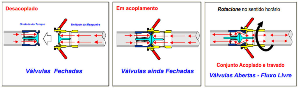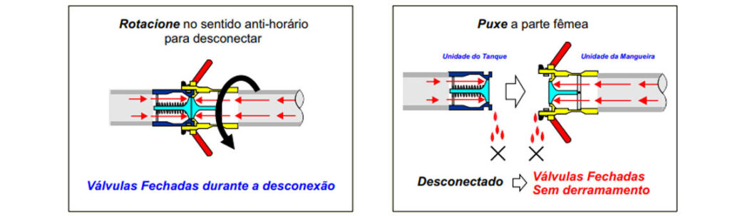 Válvulas em ambas as metades (macho e fêmea) abrem e fecham automaticamente (