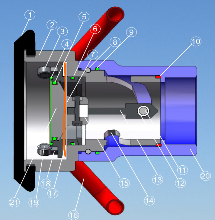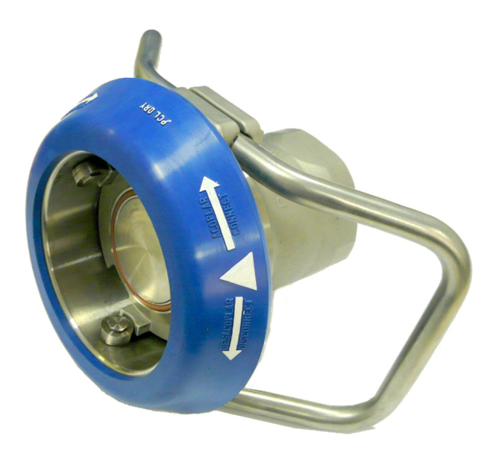 Rotacionando a manopla no sentido anti-horário, as válvulas se fecham, estancando o fluxo antes do desacoplamento físico das duas metades